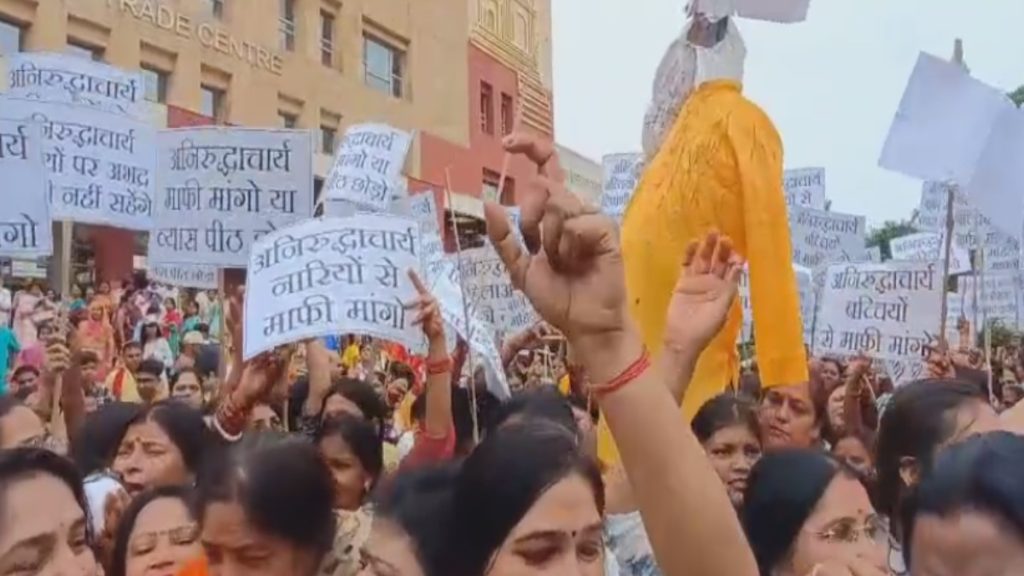 वाराणसी। कथावाचक और समाजसेवी अनिरुद्धाचार्य के ख‍िलाफ मंगलवार को  महि‍लाओं ने मोर्चा खोल द‍िया। महि‍लाओं ने पोस्‍टर बैनर के साथ प्रदर्शन करते हुए उनपर अभ‍ियोग पंजीकृत करने की मांग की है। इस दौरान मह‍िलाएं लगातार नारेबाजी करती रहीं और कड़ी कार्रवाई की मांग करते हुए व‍िध‍िक कार्रवाई की मांग की।शंकर सेना की महिला कार्यकर्ताओं ने कहा कि यदि कार्रवाई नहीं हुई तो वह आत्मदाह तक करने के लिए तैयार हैं। कहा क‍ि अनि‍रुद्धाचार्य की गिरफ्तारी न होने पर महिलाएं पूरे देश में विरोध प्रदर्शन करेंगी, सड़कों पर उतरेंगे और आमरण अनशन पर बैठ जाएगी। कथावाचक अनिरुद्धाचार्य द्वारा महिलाओं को लेकर की गई अभद्र टिप्पणियों के प्रति पूरे देश में लगातार आक्रोश बढ़ता जा रहा है। शंकर सेना उत्तर प्रदेश महिला विंग की अध्यक्ष प्रियंका द्विवेदी और उनके साथ  तमाम पदाधिकारी  और कार्यकर्ताओं ने अनिरुद्धाचार्य प्रकरण में उनके पुतले के मुंह पर कालिख पोता है। अनिरुद्धाचार्य के चेहरे पर लिखा था मैंने चार बार मुंह मारा माथे पर लिखा था टेस्ट ड्राइव। अन्य शरीर पर तमाम स्लोगन लिखे हुए थे। इस दौरान मह‍िलाओं बच्चियों ने अनिरुद्धाचार्य के पुतले का मुंह काला किया।इस दौरान महिलाएं कथा वाचक के पुतले को लेकर नारेबाजी करते हुए कार्रवाई की मांग कर रही थी। हालांकि मौके पर मौजूद पुलिसकर्मियों ने महिलाओं को दीनदयाल हस्तकला संकुल से आगे नहीं बढ़ने दिया। जबकि महिलाओं की मांग थी कि वह कचहरी पहुंचकर कलेक्टर कार्यालय पर ज्ञापन सौंपेंगे। वहीं मौके पर पहुंची नायब तहसीलदार प्रीति पांडे ने आक्रोशित महिलाओं से ज्ञापन लेते हुए कार्रवाई का आश्वासन दिया।वहीं व‍िरोध प्रदर्शन के दौरान महि‍लाओं ने पुतले का मुंह काला करने के बाद आक्रोश में जूते चप्पलों से पीटकर बुरी तरह से पुतले को घसीटा। इसके बाद मुख्यमंत्री उत्तर प्रदेश योगी आदित्यनाथ को संबोधित एक ज्ञापन जिला अधिकारी को दिया गया। ज्ञापन में मांग की गई क‍ि अनिरुद्ध आचार्य के विरुद्ध बाल विवाह अधिनियम तथा बाल यौन उत्पीड़न का मुकदमा दर्ज कर उनको गिरफ्तार किया जाए। मह‍िलाओं ने कहा क‍ि यद‍ि उनकी मांगें नहीं मानी गईं तो देश भर में प्रदर्शन करने को वह बाध्‍य होंगी।