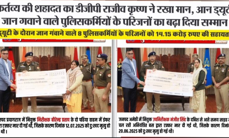 12 जुलाई 2025 को ड्यूटी के दौरान डंपर से टक्कर में उनका निधन हुआ था। उनके परिवार को 2.12 करोड़ रुपये का चेक प्रदान किया गया। उप-निरीक्षक सुरेश प्रसाद गोंड (महराजगंज) 1 अप्रैल 2025 को पुलिस कार्यालय जाते समय ट्रैक्टर से टक्कर में जान गई। परिजनों को 1.70 करोड़ रुपये की सहायता दी गई। उप-निरीक्षक मंजीत सिंह (अमेठी) दबिश के बाद लौटते समय 20 जून 2025 को अनियंत्रित बस से टक्कर में मृत्यु। परिवार को 1.70 करोड़ रुपये। उप-निरीक्षक मोहित कुमार (शाहजहांपुर) 1 फरवरी 2025 को पीछे से आ रहे ट्रक ने कार को टक्कर मारी। परिजनों को 1.70 करोड़ रुपये। मुख्य आरक्षी सुरेन्द्र सिंह (12वीं पीएसी) 5 अप्रैल 2025 को फतेहपुर लौटते समय अज्ञात वाहन से टक्कर में निधन। परिवार को 1.85 करोड़ रुपये। मुख्य आरक्षी अनुज कुमार (गाजियाबाद कमिश्नरेट) 11 अगस्त 2025 को पीआरवी वैन से बॉक्स निकालते समय ट्रक की टक्कर से मृत्यु। परिजनों को 1.70 करोड़ रुपये। आरक्षी बीर बहादुर (चंदौली) 6 अगस्त 2025 को ड्यूटी के कार्य से जाते समय ट्रक की टक्कर से जान गई। परिवार को 1.70 करोड़ रुपये। आरक्षी राज गुप्ता (सिद्धार्थनगर) सिर में गंभीर चोट के बाद इलाज के दौरान 29 अप्रैल 2025 को निधन। परिजनों को 1.70 करोड़ रुपये प्रदान किए। डीजीपी राजीव कृष्णा ने कहा कि यह सहायता किसी भी तरह से उस क्षति की भरपाई नहीं कर सकती, लेकिन यह सरकार की ओर से एक ठोस प्रयास है कि शहीद पुलिसकर्मियों के परिवार आर्थिक असुरक्षा से न जूझें।
