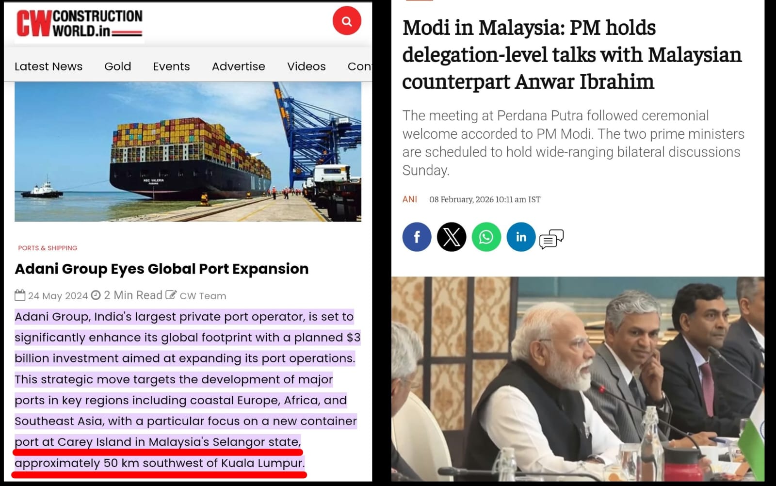 दरअसल, पीएम बनने के बाद नरेंद्र मोदी साल 2015 में पहली बार मलेशिया गए थे। सोशल मीडिया में चल रहीं कयासबाजियों के मुताबिक उसी यात्रा में मलेशिया के कैरी द्वीप में माल ढुलाई के लिए एक बड़ा बंदरगाह बनाने की अदानी समूह की दिलचस्पी का जिक्र हुआ। इस यात्रा के दो साल बाद, यानी 2017 में अदानी समूह ने मलेशिया के सेलांगोर प्रांत के अंतर्गत कैरी द्वीप में चौथे बंदरगाह के विस्तार के लिए वहां की सरकार के साथ एक अनुबंध किया। सोशल मीडिया में ऐसी कई पोस्ट में दावा किया जा रहा है कि इससे पहले भी पीएम मोदी श्रीलंकाश्रीलंका, बांग्लादेश, तंजानिया और इजरायल गए और पीछे वहां अदानी ने भी बंदरगाह की परियोजना लगवा ली। यह दावा इसलिए संदेह से परे नहीं है, क्योंकि वास्तव में अदानी से ऐसा ही किया और इसी के आधार पर सोशल मीडिया में यह कयास लगाते रहे हैं कि पीएम मोदी की कोई भी विदेश यात्रा बिना अदानी का मकसद पूरा किए खत्म नहीं होती।
